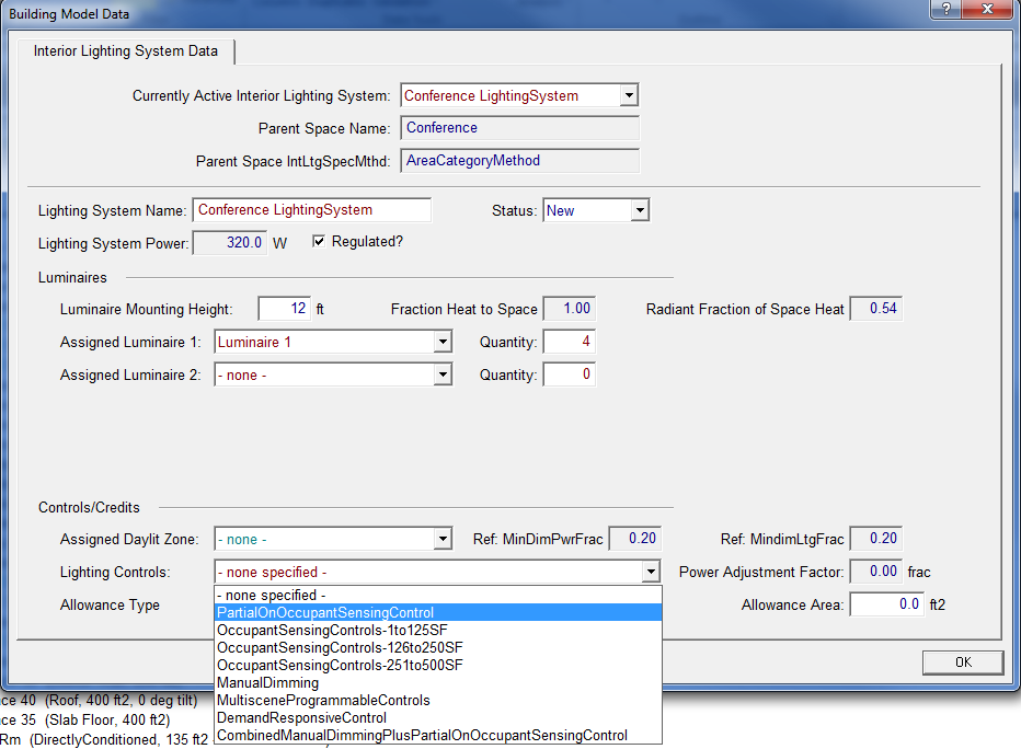 A: Lights can be defined as a lighting power density or within a lighting system. The lighting system method allows the entry of luminaire types and the quantity of each type in the space. Each lighting system can be assigned to a daylit area type for use with daylighting controls: Skylit, the portion of the floor that receives daylight from a skylight; Primary Sidelit, portion of the floor that receives the highest amount of daylight from a window; Secondary Sidelit, portion of the floor that receives a lower, but still useful, amount of light from a window; or none for that portion of the space which is not daylit.